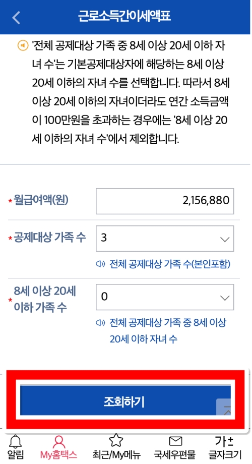 7. 월 급여액과 공제대상 가족 수를 모두 입력했다면, 화면 하단에 있는 '조회하기'를 눌러 결과를 확인합니다. 잠시 후 입력한 정보를 바탕으로 계산된 세액이 나타납니다.