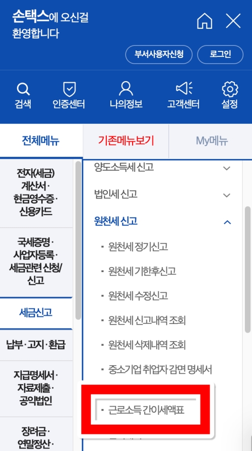 4. 원천세 신고와 관련된 여러 메뉴 중에서 화면을 아래로 내려 '근로소득 간이세액표'를 찾아 선택합니다. 이 메뉴를 통해 월 급여에 따른 원천징수 세액을 조회할 수 있습니다.