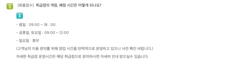 직접 물건을 찾으러 가야 한다면 취급점의 운영 시간을 미리 확인하는 것이 좋겠죠? 취급점은 보통 평일에는 오전 9시부터 오후 6시까지, 공휴일이나 토요일에는 오전 9시부터 12시까지 운영해요. 일요일은 휴무고요. 다만, 지점마다 고객 편의를 위해 운영 시간을 조금씩 다르게 할 수도 있으니, 방문하기 전에 해당 취급점에 미리 전화로 확인해보는 것을 추천합니다.