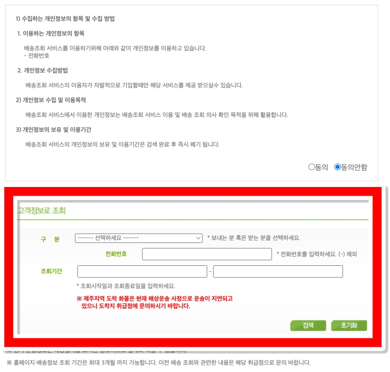 '고객정보로 조회하기'를 선택하면 먼저 개인정보 수집 및 이용에 대한 동의 절차가 나타나요. 내용을 확인하고 '동의'를 선택한 뒤, 아래 '고객정보 조회'란을 채워주시면 됩니다. 보내는 분인지 받는 분인지 구분해서 선택하고, 해당하는 사람의 전화번호를 입력하세요. 그리고 조회를 원하는 기간을 설정하면 되는데, 최대 3개월까지 조회가 가능합니다. 모든 정보를 입력했다면 '검색'을 눌러주세요.