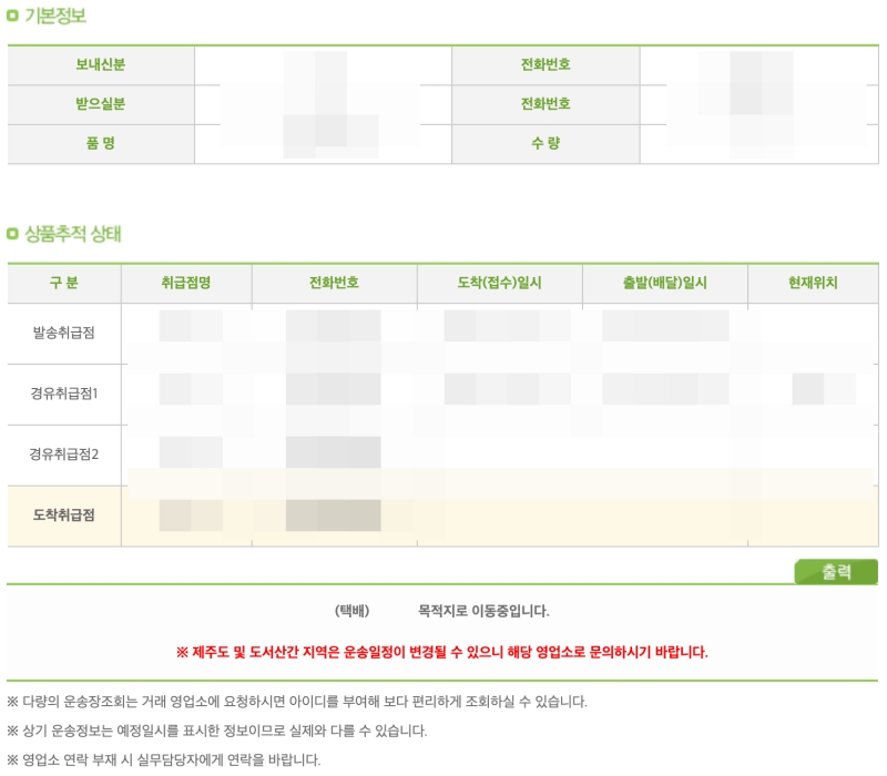 조회가 완료되면 내 택배의 상세한 이동 과정을 한눈에 볼 수 있습니다. 보내는 분과 받는 분의 기본 정보부터 시작해서, '상품추적상태' 항목에서는 내 물건이 어느 취급점에서 출발해 어떤 곳들을 거쳐 도착 취급점으로 이동하고 있는지 실시간으로 확인할 수 있어요. 지금 내 택배가 목적지를 향해 잘 이동하고 있다는 것을 알 수 있으니 한결 마음이 놓이더라고요.