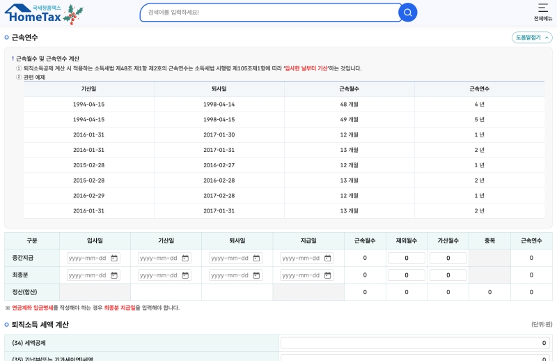 퇴직소득세 계산에 있어 급여만큼이나 중요한 것이 바로 '근속연수'입니다. 근무한 기간에 따라 세금 공제액이 크게 달라지기 때문인데요. 화면을 아래로 내려 '근속연수' 항목에 내가 입사한 날짜와 퇴사한 날짜, 그리고 중간에 정산을 받았다면 그 기간까지 꼼꼼하게 입력해주세요. 그러면 총 근무 개월 수와 연수가 자동으로 계산되어 반영됩니다.