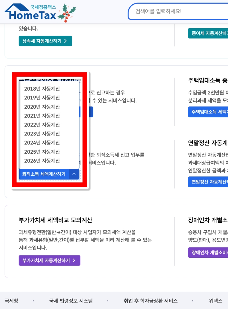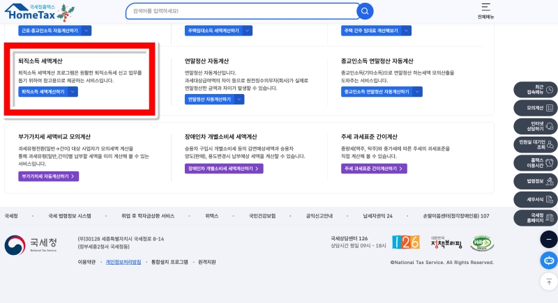이제 우리가 사용할 계산기를 찾아볼 차례예요. 화면을 아래로 조금 내려보면 여러 계산기 항목 중에서 '퇴직소득 세액계산'을 발견할 수 있습니다. 원활한 퇴직소득 신고 업무를 돕기 위해 제공되는 서비스라고 하네요. 이 기능을 이용하기 위해 파란색으로 된 '퇴직소득 세액계산하기'를 눌러 다음 단계로 이동합니다.
