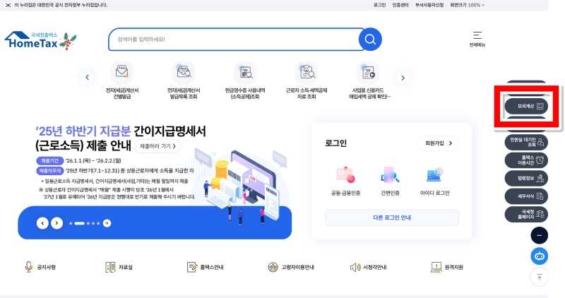 세금 계산이라고 해서 처음부터 어렵게 생각할 필요는 없어요. 우선 국세청 홈택스 홈페이지에 접속해 주세요. 복잡해 보이는 첫 화면이지만, 오른쪽을 보면 자주 쓰는 기능들을 모아놓은 빠른 실행 메뉴가 있습니다. 여러 아이콘 중에서 계산기 모양의 '모의계산'을 찾아 선택하면 모든 과정이 시작됩니다.