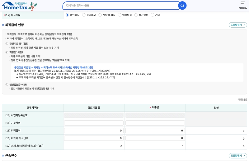 다음으로 화면을 아래로 내려 '퇴직급여 현황'을 입력해야 해요. 이 부분이 가장 중요하다고 할 수 있는데요. 나의 퇴직 유형이 정년퇴직인지, 중간정산을 받았는지 등을 선택하고 퇴직으로 인해 지급받는 총급여액과 비과세 퇴직급여 등을 정확하게 기입해야 실제와 가까운 예상 세액을 확인할 수 있습니다.