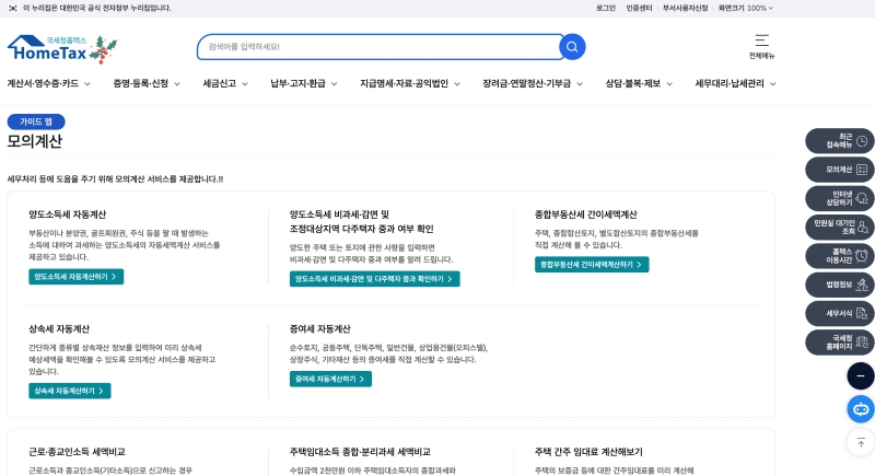 '모의계산' 페이지로 들어가면 우리가 일상에서 마주할 수 있는 다양한 세금 항목들을 미리 계산해 볼 수 있는 서비스들이 모여 있어요. 양도소득세나 상속세, 증여세처럼 혼자서는 계산하기 어려운 세금들을 간편하게 알아볼 수 있도록 되어 있어 알아두면 정말 유용한 곳이에요.