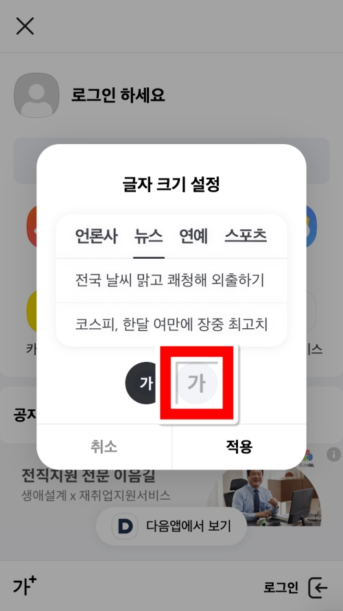 내가 원하는 크기로 글자 크기를 선택했다면, 이제 이 설정을 저장할 차례예요. 글자 크기 설정 창 아래에 있는 '취소'와 '적용' 중에서 '적용'을 눌러주세요. 이 과정을 거쳐야만 내가 선택한 글자 크기가 앱 전체에 반영됩니다.