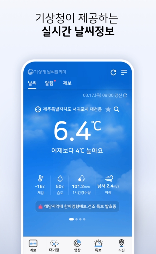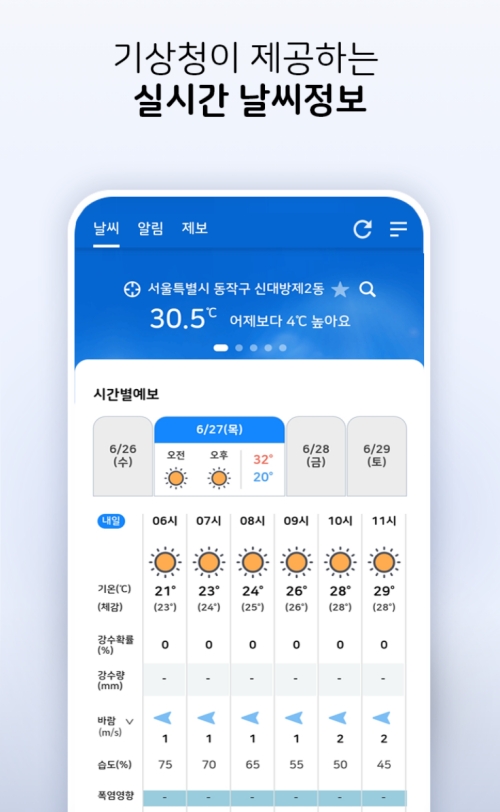앱을 실행하면 가장 먼저 현재 위치의 날씨를 한눈에 볼 수 있는 화면이 나타나요. 기상청이 제공하는 실시간 정보답게 현재 기온은 물론, 체감온도와 습도, 1시간 강수량, 풍향과 풍속까지 아주 상세하게 표시해 줍니다. '어제보다 4℃ 높아요' 같은 직관적인 비교 정보는 옷차림을 결정하는 데 큰 도움이 되더라고요.
