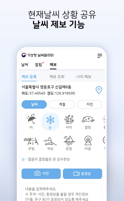 가끔 예보와 실제 날씨가 다르게 느껴질 때가 있죠? 그럴 때는 내가 직접 현재 날씨를 제보할 수도 있습니다. '제보' 탭으로 이동하면 비나 눈, 서리, 결빙 등 현재 내가 겪고 있는 날씨 현상을 사진이나 동영상과 함께 직접 등록할 수 있어요. 이렇게 모인 시민들의 제보는 더 정확한 동네 날씨 정보를 만드는 데 기여하게 됩니다.