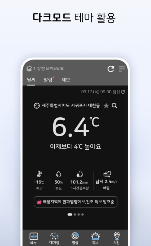 늦은 밤이나 어두운 곳에서 날씨를 확인할 때 눈이 부시지 않도록 배려하는 '다크모드' 테마도 지원합니다. 간단한 설정 변경만으로 전체적인 화면을 어둡게 바꿀 수 있어, 언제 어디서든 눈의 피로 없이 편안하게 날씨 정보를 확인할 수 있다는 점도 장점이에요.