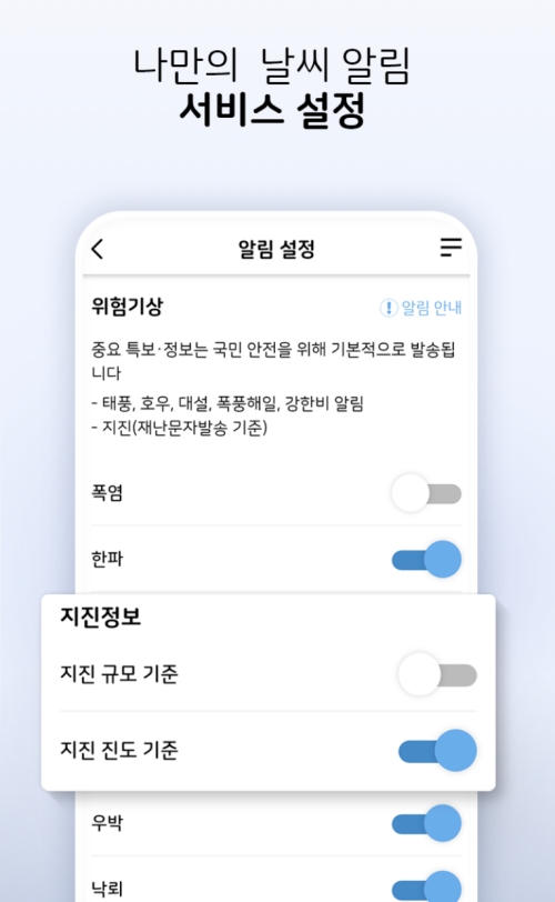 내가 원하는 정보만 골라서 알림을 받을 수 있는 '나만의 날씨 알림' 설정 기능도 아주 유용해요. 폭염이나 한파, 지진, 우박 등 다양한 기상 현상 중에서 내가 특별히 주의하고 싶은 항목만 골라 알림을 설정해두면, 불필요한 알림 없이 나에게 꼭 필요한 정보만 받아볼 수 있습니다.