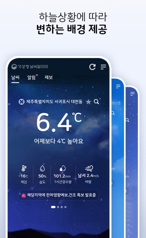 이 앱의 소소한 매력 중 하나는 바로 하늘 상황에 따라 배경 화면이 바뀐다는 점이에요. 맑은 낮에는 푸른 하늘이, 해가 진 저녁에는 별이 빛나는 밤하늘이 나타나죠. 비가 오거나 눈이 올 때도 그에 맞는 배경이 적용되어, 앱을 켜는 것만으로도 현재 날씨를 직관적으로 느낄 수 있어 좋았습니다.
