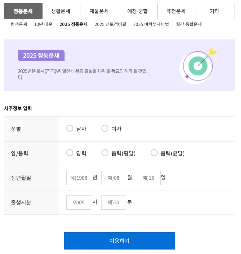 8. 이곳 역시 자신의 사주 정보를 정확하게 입력하는 것으로 시작해요. 성별과 생년월일시를 기입하고 '이용하기'를 누르면 2025년 한 해에 대한 상세한 풀이를 받아볼 수 있습니다.