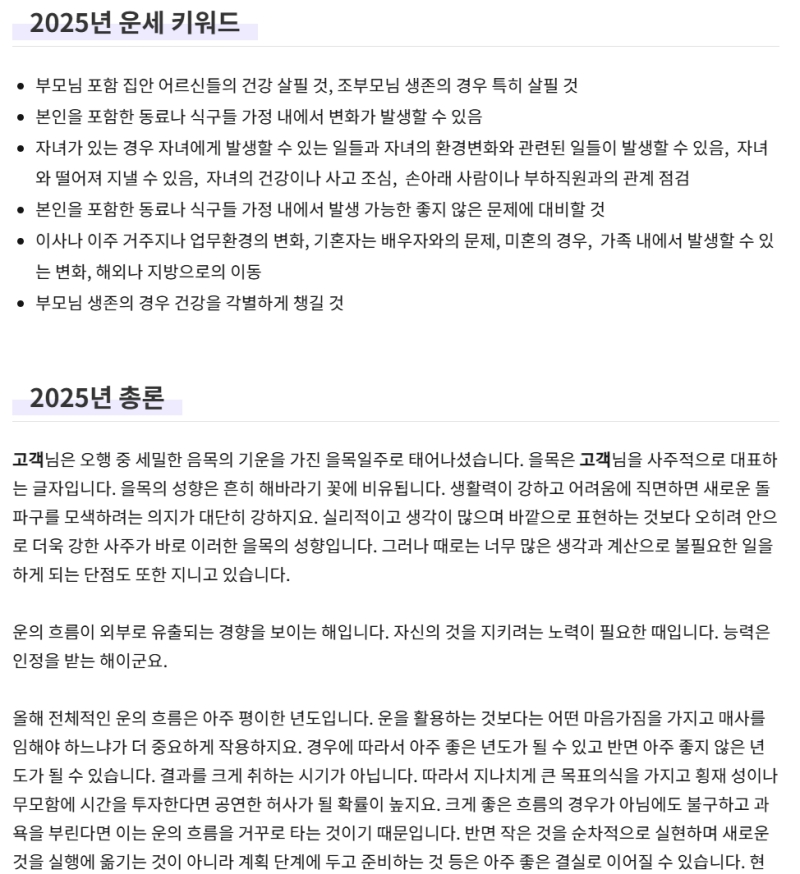 9. 결과에서는 한 해 동안 영향을 미칠 주요 키워드와 함께 전반적인 총운을 확인할 수 있어요. 이를 통해 어떤 마음가짐으로 한 해를 보내면 좋을지 방향을 설정하고 새로운 변화에 대비할 수 있습니다.