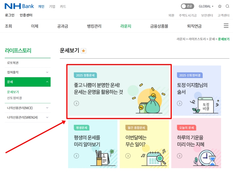 7. 신한라이프 외에 다른 곳에서도 비슷한 운세 서비스를 찾아볼 수 있어요. 예를 들어 NH농협은행의 라이프스토리 코너에서는 '정통운세'를 통해 한 해의 운세를 깊이 있게 들여다볼 수 있습니다.