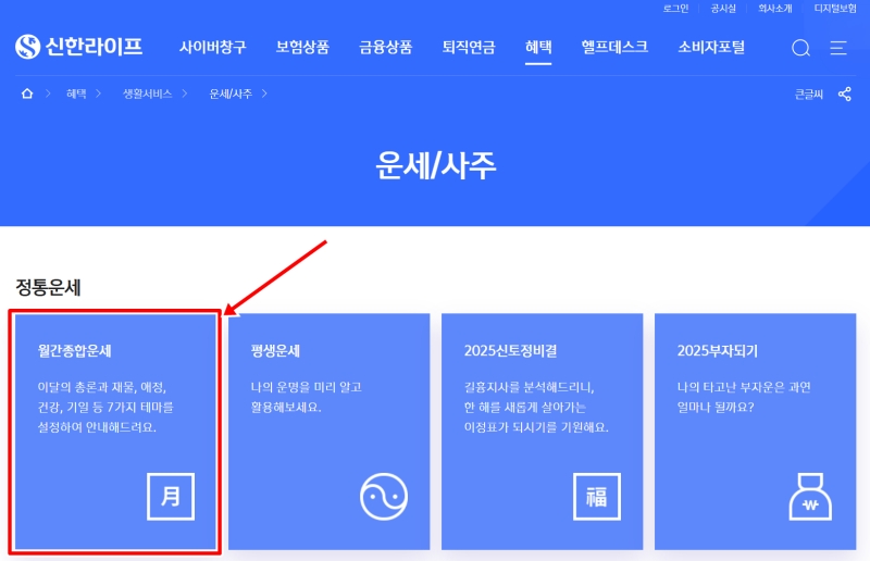 1. 운세 서비스 페이지에 접속하면 정통운세, 평생운세 등 다양한 종류의 운세를 만나볼 수 있어요. 그중 '월간종합운세'를 선택하면 다가오는 한 달의 기운을 재물, 애정, 건강 등 7가지 주제로 나누어 상세하게 미리 살펴볼 수 있습니다.