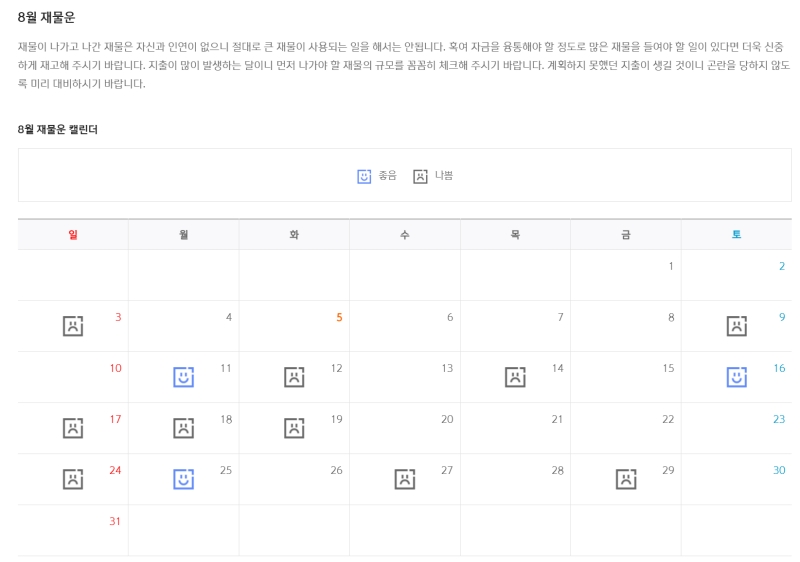 5. 재물운이 궁금하다면 재물운 캘린더를 통해 돈의 흐름이 좋은 날과 나쁜 날을 한눈에 파악할 수 있어요. 계획하지 않았던 지출이 발생할 수 있는 날을 미리 확인하고 대비하는 지혜를 얻을 수 있습니다.