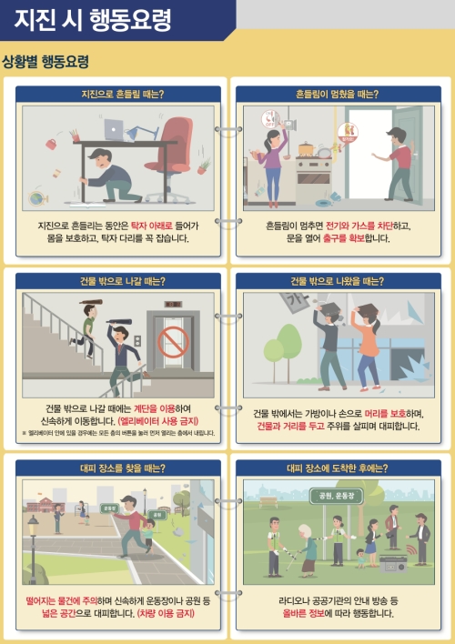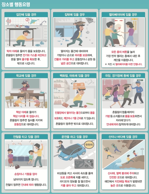 내가 어디에 있느냐에 따라서도 행동 요령이 조금씩 달라져요. 집에 있을 때는 탁자 밑으로, 학교에서는 책상 밑으로 몸을 피해야 합니다. 엘리베이터 안이라면 모든 층의 버튼을 눌러 가장 먼저 열리는 층에서 내리고, 운전 중이었다면 도로 오른쪽에 차를 세우고 키를 꽂아둔 채 대피해야 해요. 이처럼 상황에 맞는 행동 요령을 미리 숙지해두는 것이 정말 중요하답니다.