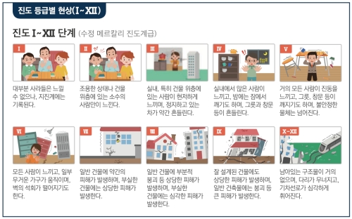 '진도'가 실제로 어느 정도의 흔들림을 의미하는지 알 수 있도록 등급별로 나눈 표가 있어요. 예를 들어 진도 I은 대부분 사람이 느낄 수 없지만, 진도 V 정도가 되면 거의 모든 사람이 진동을 느끼고 불안정한 물체가 넘어지기 시작해요. 그리고 진도 IX 이상이 되면 잘 설계된 건물에도 심각한 피해가 발생하고, 다리나 선로가 휘어질 정도로 강력한 흔들림을 의미합니다.