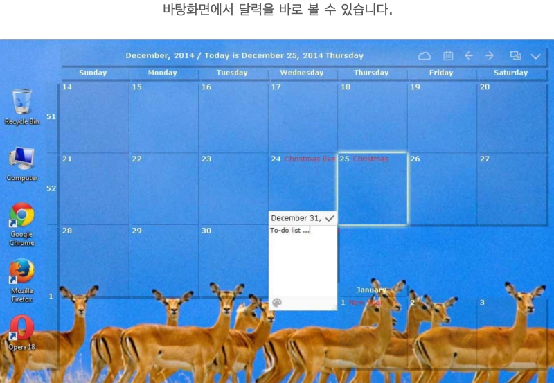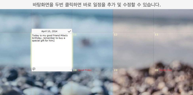설치를 마치고 나면 마치 배경화면의 일부인 것처럼 바탕화면에 달력이 자연스럽게 나타나요. 덕분에 다른 프로그램을 실행할 필요 없이 언제든지 한눈에 날짜와 일정을 확인할 수 있더라고요. 특정 날짜에 할 일이 있다면 해당 날짜 칸을 더블클릭해서 간단하게 메모를 추가할 수도 있습니다.