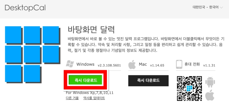 새로운 프로그램을 설치하는 건 언제나 조금 설레는 일이죠. 먼저 알려드린 홈페이지에 접속하면 바로 프로그램을 내려받을 수 있는 화면이 나타나요. 윈도우, 맥, 휴대 전화용이 있는데, 윈도우 컴퓨터에 설치할 것이므로 왼쪽에 있는 초록색 '즉시 다운로드' 부분을 선택하면 바로 설치 파일이 받아집니다.